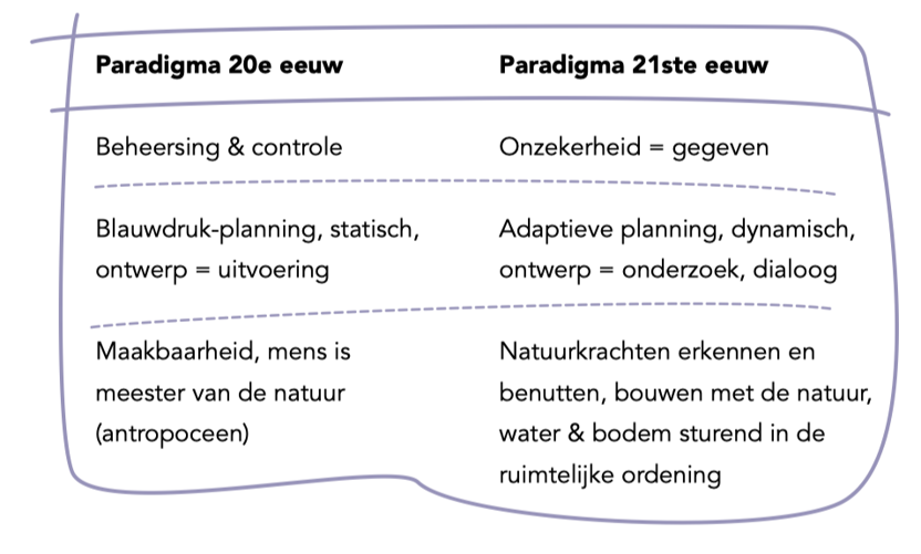Door de Deltawerken en de grote technologische innovaties waren we overtuigd geraakt van de maakbaarheid van de fysieke ruimte. We spraken over klimaatadaptatie alsof die in een handomdraai gefikst was. Met alleen harde technologie konden we ons land echter niet langer beschermen, we leerden weer met het water te leven en gingen bouwen met de natuur.
